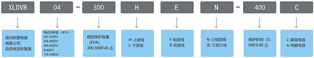 举例: XL DVR 04-300HFN-040C (DVR产 品400VAC 300KVA.上进线前接线, 保护时间0. 4s,储能元件为超级电容)