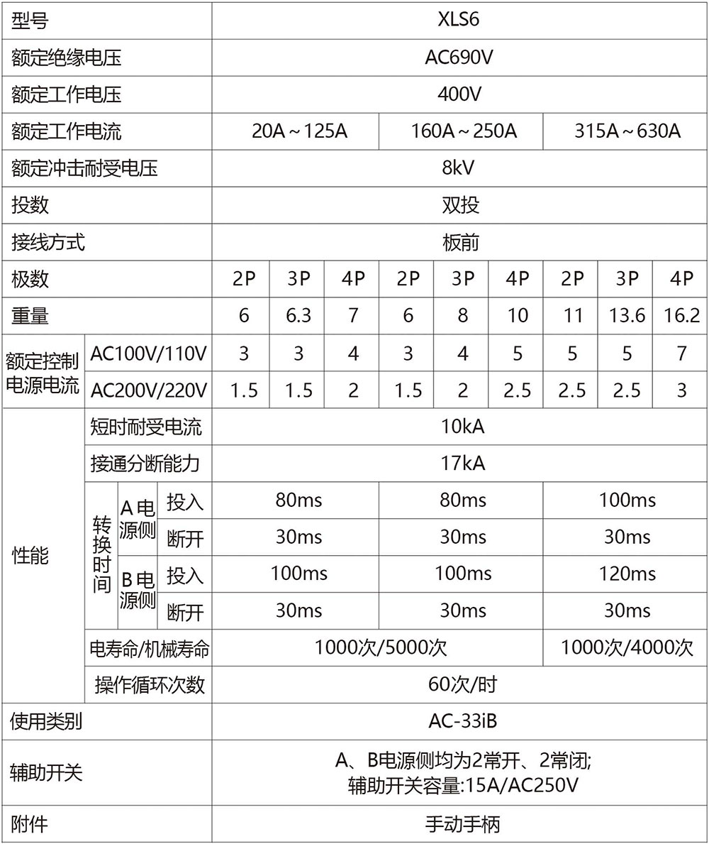 XLS6系列双电源自动转换开关主要用于交流400V及以下、额定频率50HZ。在电源出现缺相、过压、欠压等故障情况时,在控制器的控制下转换开关能迅速将负载从常用电源换至备用电源(此时备用电源必须正常)。用户还可以在需要时使负载处于一个中间位置,使负载既不与常电源接通也不与备用电源接通。本产品主要用于国家规定的一级、二级负荷,广泛适用于消防邮电通讯、医院、宾馆、城市轨道交通、高层楼宇、工业流水线、电视台等需要连续供电的场所。常用电源可以是电网、自启动发电机组、蓄电池组等。