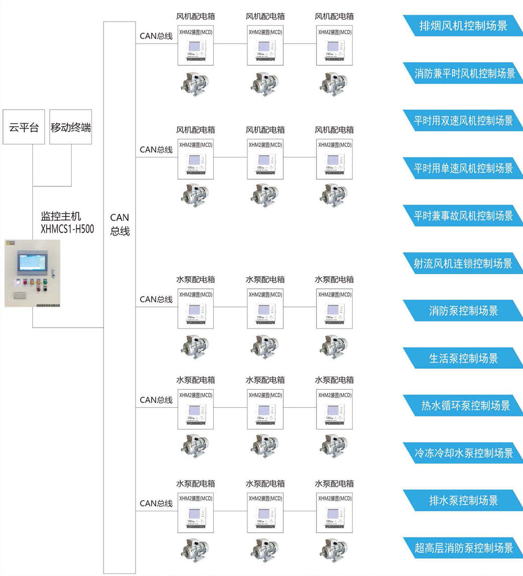 XHMCS1系列电动机--体化监控管理系统是XHM2系列电动机控制与保护装置(MCD)、CAN现场总线和远程集中监控主机H500组成。适用于所有建筑领域关于电动机控制的风机及水泵使用的场合。